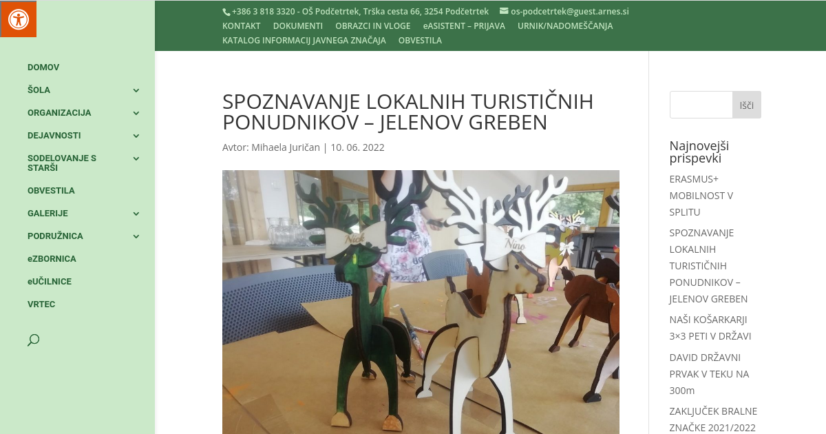 Učenci 7. razredov, ki obiskujejo izbirni predmet Turistična vzgoja, so v letošnjem šolskem letu med drugim spoznavali tudi lokalno turistično ponudbo ter ponudnike, ki so predstavljali svoje dejavnosti. V sredo, 8. 6. 2022, so dobili priložnost, da si novi turistično proizvodni center Jelenov greben ogledajo tudi v živo. Po vodenem ogledu lesnega in laserskega studia ter mali učni uri spoznavanja vrst in namembnosti različnih vrst lesa in načinov graviranja so sledile delavnice, kjer so si učenci izdelali in pobarvali lesenega jelenčka. Nato so se peš odpravili do domačije Jelenov greben, kjer so uživali ob hranjenju živih jelenov.