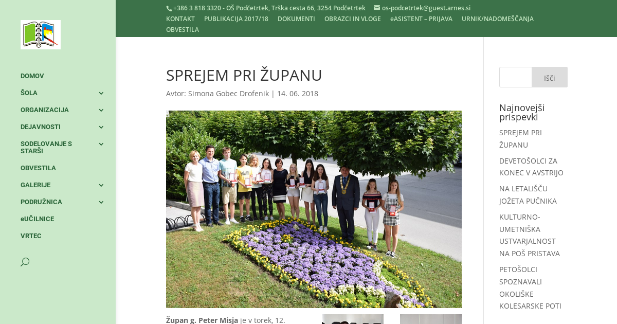 Župan g. Peter Misja je v torek, 12. junija 2018 sprejel učence naše šole. Sprejema so se udeležili učenci, ki so na področju znanja, kulturnega poustvarjanja, raziskovalnih dejavnosti in športa dosegli izjemne uspehe. Slavnostnega dogodka so se udeležili njihovi mentorji, razrednika devetih razredov in ga. ravnateljica Sonja Švajger. Dejan Fistrić, Jan Herček, Manuela Keršič, Eva Drofenik, Samanta Šalamon, Amanda Amon, Nika Herček, Ema Govedič in Nuša Toplišek so vseh devet let šolanja izkazovali prizadevnost in dosegali vidne rezultate na področju šolskega dela. Zato so prejeli zlate petke in spominsko darilo. Učence sta spremljala razrednika ga. Eva Cankar in g. Boštjan Šelekar. Na področja športna so izjemen rezultat dosegli igralci košarke 3 na 3. Ekipo OŠ Podčetrtek so na tekmovanju zastopali Gašper Škorjanc, Rene Brin, Andraž Švigelj in Nejc Švigelj. Mentor ekipe je bil g. Boštjan Šelekar. Tekmovalci in njihov mentor so osvojili 1. mesto na državnem nivoju. Za njihove dosežke jim je župan prav tako čestital in podelil s spominska darila. Spominsko darilo so prejele tudi Sabina Brin, Maša Čoh, Kaja Mikša, Martina Komerički, Daša Smole in Živa Turk. Pod vodstvom mentorja g. Darka Pepevnika so v okviru SAFE.SI video natečaja »Obnašanje in komuniciranje na spletu – lepo je, če si na spletu prijazen!«, z vzgojno-izobraževalnim filmčkom z naslovom Nevedna Frida, osvojile 1. mesto v svoji kategoriji. V okviru državnega projekta Turizmu pomaga lastna glava so letos sodelovale Amanda Amon, Nika Herček, Samanta Šalamon, Larisa Ramšak in Eva Drofenik pod mentorstvom ga. Simone Gobec Drofenik in ga. Eve Cankar. Učenke so izdelale turistično nalogo z naslovom CÜKRI PA TAO, oblikovale so stojnico, Facebook profil in pripravile animacijo. Za svoje delo so prejele zlato priznanje. Tudi njim je g. župan podelil spominska darila. Foto: Karmen Cvirn