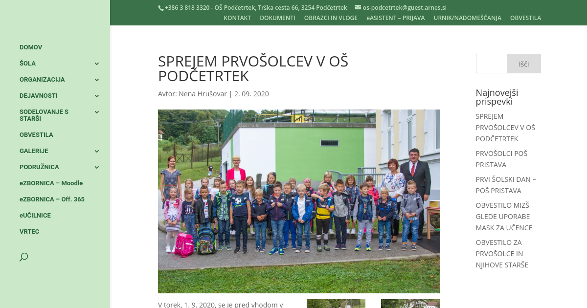 V torek, 1. 9. 2020, se je pred vhodom v »staro šolo« odvijal slovesen vstop otrok v 1. razred. Ob zvokih slovenske himne, spremnemu govoru, ki ga je iskrivo vodila Ana Žerjav in ubranemu petju Alekseja Ivačiča Kolarja, smo v Osnovno šolo Podčetrtek sprejeli 25 učencev. G. župan Peter Misja je otroke veselo pozdravil, jim zaželel, da se dobro učijo, prihajajo v šolo spočiti in jih obdaril s knjigico »Prvi šolski dan«. Učiteljica Nena Hrušovar je vsem skupaj zaželela, da postanejo prvošolci odgovorni posamezniki, ki spoštuje sebe in druge: »Otrokom pustimo odgovornost, da svoje obveznosti izvajajo čim bolj samostojno, ker je to pot do njihovega uspeha.« Vsi zaposleni želimo, da boste prvošolci radi obiskovali šolo in stkali nova prijateljstva za celo življenje.