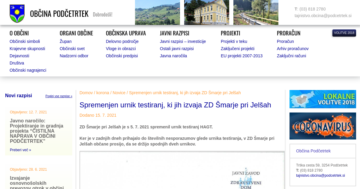 ZD Šmarje pri Jelšah je s 5. 7. 2021 spremenil urnik testiranj HAGT. Ker je v zadnjih dneh prihajalo do številnih nesporazumov glede urnika testiranja, v ZD Šmarje pri Jelšah občane prosijo, da se držijo spodnjih dveh urnikov.