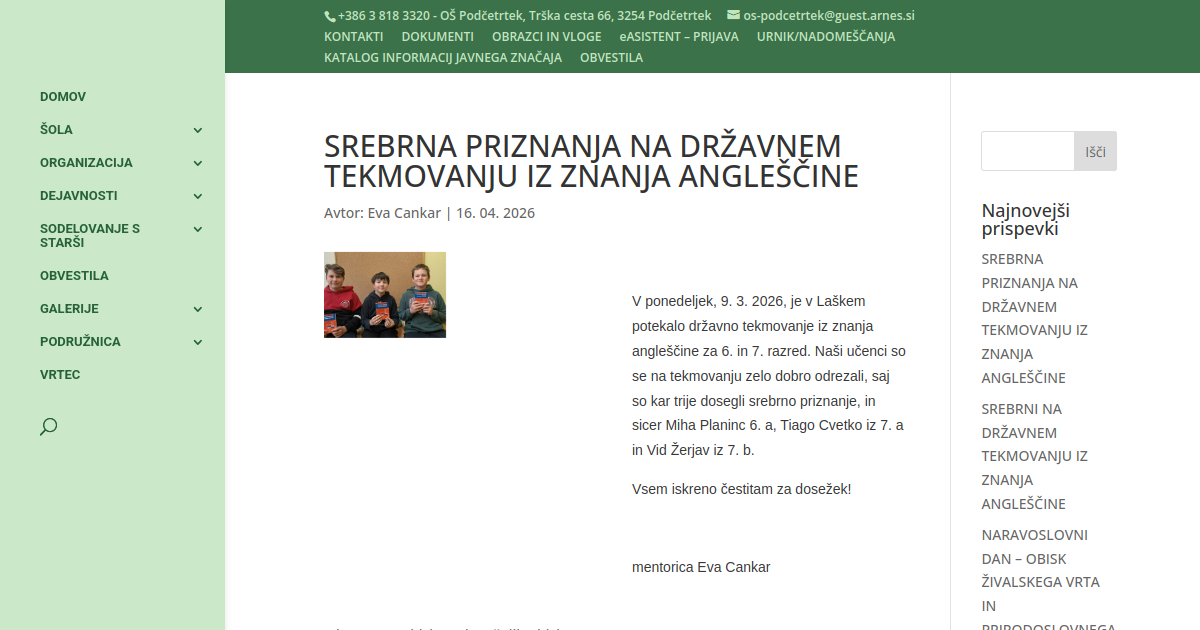 SREBRNA PRIZNANJA NA DRŽAVNEM TEKMOVANJU IZ ZNANJA ANGLEŠČINE
