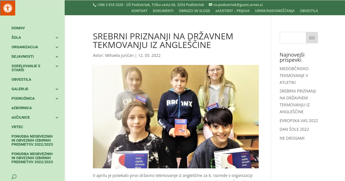 V aprilu je potekalo prvo državno tekmovanje iz angleščine za 6. razrede v organizaciji Društva učiteljev angleškega jezika IATEFL, ki se ga je udeležilo 5 učencev OŠ Podčetrtek. Sašo Cverlin, Vid Drofenik, Dejan Ocvirk, Larisa Tornar Kokol in Maja Pavčnik so na šolskem tekmovanju zbrali dovolj točk, da so dosegli bronasto priznanje in s tem uvrstitev na naslednjo stopnjo tekmovanja.