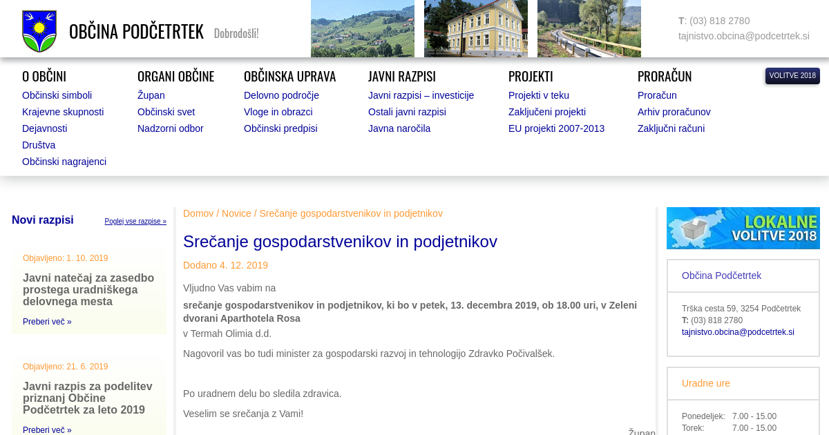 Vljudno Vas vabim na srečanje gospodarstvenikov in podjetnikov, ki bo v petek, 13. decembra 2019, ob 18.00 uri, v Zeleni dvorani Aparthotela Rosa, v Termah Olimia d.d. Nagovoril vas bo tudi minister za gospodarski razvoj in tehnologijo Zdravko Počivalšek. Po uradnem delu bo sledila zdravica. Veselim se srečanja z Vami! Župan Peter MISJA