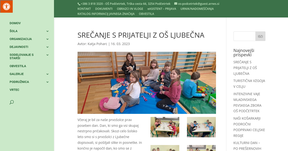 Danes je bil za naše prvošolce prav poseben dan. Dan, ki smo ga vsi skupaj nestrpno pričakovali. Skozi celo šolsko leto smo si s prvošolci z Ljubečne dopisovali, si pošiljali slike in posnetke. In končno je napočil dan, ko smo se z avtobusom odpravili na obisk k našim prijateljem. Najprej smo pomalicali, saj nas je čakal pester dan. V telovadnici so nas medtem že čakali učenci, ki so za nas pripravili dve plesni točki in glasbeno pravljico Rokavička. Nagovorila nas je tudi gospa ravnateljica. Nato se je lahko začel delovni del našega druženja. V prvem delu smo se čisto prvič spoznali s snemanjem pesmi. In lahko se pohvalimo, da nam je šlo res dobro! Snemali smo pesem od Nike Zorjan – Zate dovolj. Ko smo jo že četrtič ponovili, smo naenkrat slišali petje, ki je bilo čisto zares podobno Nikinemu. Ostali smo kar malo brez besed, ko smo pred sabo zagledali pevko Niko Zorjan, a smo hitro izgubili tremo in zapeli ter zaplesali skupaj z njo. V drugem delu pa je bil končno čas, da se povežemo z našimi novimi prijatelji. Razdelili smo se v štiri skupine in krožili po različnih delavnicah – v eni smo se skozi zabaven poligon dobro razmigali, v drugi smo ustvarjali, v tretji smo igrali družabne igre, v četrti pa smo se preizkusili v kvizu. Za nami je lep in nepozaben dan. Komaj čakamo, da nas naši novi prijatelji drugo leto obiščejo v Podčetrtku.