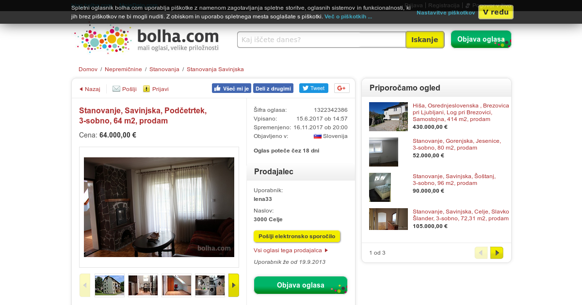 Tip: 3-sobno Velikost: 64, 00 m2 Velikost terase: 4, 50 Leto izgradnje:1978 Zadnja adaptacija:2012 Nadstropje: 3