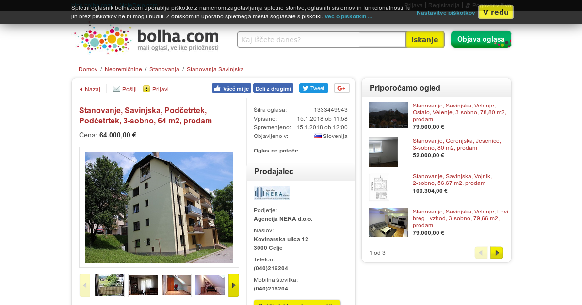 Kraj/naselje: Podčetrtek Tip: 3-sobno Velikost: 64, 00 m2 Leto izgradnje:1978 Zadnja adaptacija:2012 Nadstropje: 3