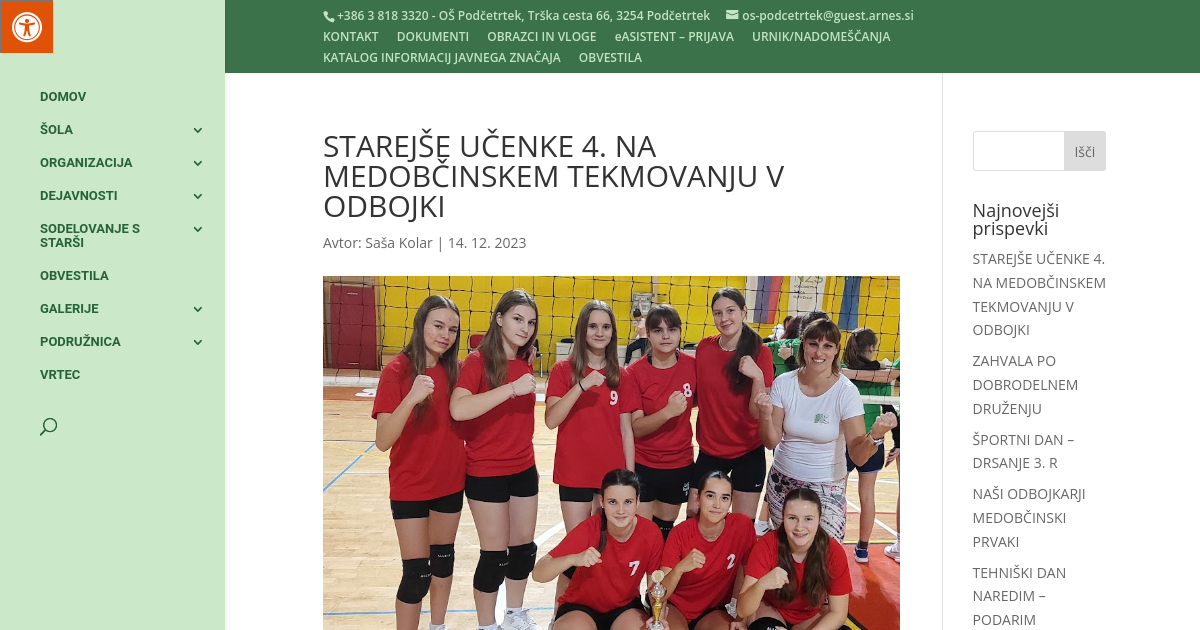 Tako kot pri fantih, se je tudi pri puncah letošnje tekmovanje v odbojki odvijalo na OŠ Rogatec. Poleg šole gostiteljice in naših učenk, so na tekmovanju nastopile še učenke iz OŠ Lesično, OŠ Bistrice ob Sotli, OŠ Šmarja pri Jelšah, OŠ Kozje in 1. OŠ Rogaške Slatine. Po uvodni tekmi, so naše naše odbojkarice suvereno ugnale vrstnice iz OŠ Kozje in nato še premagale OŠ Rogatec in si priborile nastop v polfinalu, kjer so jih čakale nasprotnice iz 1. OŠ Rogaške Slatine. Prvi niz so naše odbojkarice zmagale, drugega in tretjega pa nesrečno izgubile, zato je bila naslednja igra za 3. mesto, kjer so zopet igrale z učenkami OŠ Kozje. Kljub borbenosti, sreča ni bila na naši strani in so morale priznati premoč ter na koncu osvojile 4. mesto. Kljub vsemu so naše odbojkarice igrale odlično, na koncu jim je zmanjkalo le malo moči in športne sreče. ISKRENE ČESTITKE!