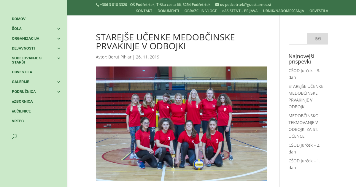 V torek 26. 11. 2019, le dan za fanti, je OŠ Rogatec ponovno gostila medobčinsko tekmovanje v odbojki tokrat za starejše učenke. Sodelovalo je sedem šol, ki so bile razdeljene v dve skupini. V skupinskem delu so se naše igralke v prvi tekmi pomerile z vrstnicami iz OŠ Kozje in po začetni nervozi zmagale z 2:0. V drugi tekmi so jim stale nasproti domačinke iz OŠ Rogatec, ki jim kljub bučnemu navijanju domačih navijačev ni uspelo, naše odbojkarice so bile še enkrat boljše z 2:0, ter se tako uvrstile v velike finale in čakale na razplet v 2. skupini. Zmagovalke te skupine so postale učenke iz OŠ Šmarje pri Jelšah, ki so po vrsti premagale OŠ Lesično, OŠ Bistrico ob Sotli in I. OŠ Rogaška Slatina. Finale se ni začel po naših željah in Šmarčanke se povedle z 1:0 v nizih. Vendar se naše igralke niso predale in po odlični igri v nadaljevanju zmagale tako v drugem kot tudi v tretjem nizu, ter tako ponovno postavile zmagovalni pokal v naše vitrine. Čestitke.