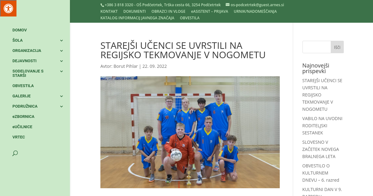 Četrtek; 22. 9. 20022. OŠ Šmarje pri Jelšah je gostilo finalni turnir v nogometu za starejše učence. Naši fantje so pripravili prijetno presenečenje in se po dramatični tekmi z zmago proti favoriziranim vrstnikom iz Rogatca uvrstili v finale, ter si s tem zagotovili tudi uvrstitev na regijsko tekmovanje. Tekma se je po rednem delu končala z rezultatom 3:3. O zmagovalcu so tako odločali kazenski streli, v katerih sta bila junaka, strelec David Jereb in vratar Toni Gubenšek s tremi obranjenimi streli. V finalni tekmi proti I. OŠ Rogaška Slatina je zmanjkalo moči in energije, vendar je tudi končno 2. mesto zadoščalo za uvrstitev v nadaljnji rang tekmovanja. Ekipo OŠ Podčetrtek so sestavljali: Timotej Plevnik, David Novoselc, Maurits Schmit, Jan Šelekar, Žan Umek, Toni Gubenšek, David Jereb in Nik Lipošek. Čestitke
