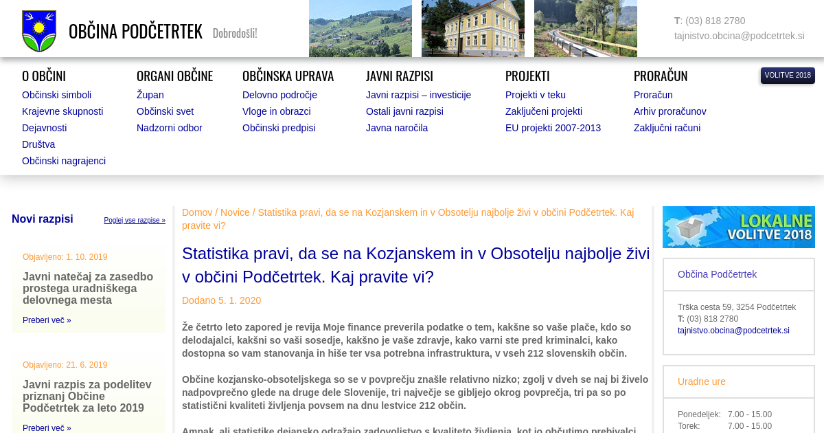 Že četrto leto zapored je revija Moje finance preverila podatke o tem, kakšne so vaše plače, kdo so delodajalci, kakšni so vaši sosedje, kakšno je vaše zdravje, kako varni ste pred kriminalci, kako dostopna so vam stanovanja in hiše ter vsa potrebna infrastruktura, v vseh 212 slovenskih občin. Občine kozjansko-obsoteljskega so se v povprečju znašle