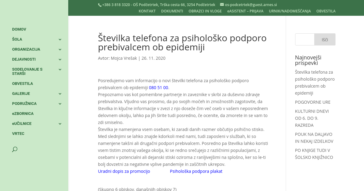 Posredujemo vam informacijo o novi številki telefona za psihološko podporo prebivalcem ob epidemiji 080 51 00. Prepoznamo vas kot pomembne partnerje in zaveznike v skrbi za duševno zdravje prebivalstva. Vljudno vas prosimo, da po svojih močeh in zmožnostih zagotovite, da številka in ključne informacije v zvezi z njo doseže čim več oseb v vašem neposrednem delovnem okolju, lahko pa jih širite tudi posredno, če ocenite, da zmorete in se vam to zdi smiselno. Številka je namenjena vsem osebam, ki zaradi danih razmer občutijo psihično stisko. Med slednjimi se lahko znajde kdorkoli med nami, tudi zaposleni v službah, ki so namenjene takšni ali drugačni podpori prebivalcem. Posredno pa številka lahko koristi vsem tistim znotraj vašega okolja, ki se redno srečujejo z različnimi populacijami, z osebami v potencialni ali dejanski stiski oziroma z ranljivejšimi na splošno, ker so le-ti bolj dovzetni za negativne vplive pandemije in zaščitnih ukrepov. Uradni dopis za promocijo Psihološka podpora plakat