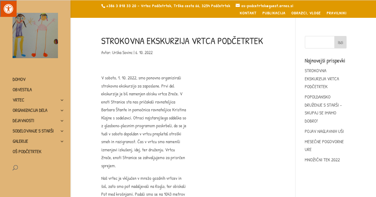 V soboto, 1. 10. 2022, smo ponovno organizirali strokovno ekskurzijo za zaposlene. Prvi del ekskurzije je bil namenjen obisku vrtca Zreče. V enoti Stranice sta nas pričakali ravnateljica Barbara Štante in pomočnica ravnateljice Kristina Klajne s sodelavci. Otroci najstarejšega oddelka so z glasbeno-plesnim programom poskrbeli, da se je tudi v soboto dopoldan v vrtcu prepletal otroški smeh in razigranost. Čas v vrtcu smo namenili izmenjavi izkušenj, idej, ter druženju. Vrtcu Zreče, enoti Stranice se zahvaljujemo za prisrčen sprejem.