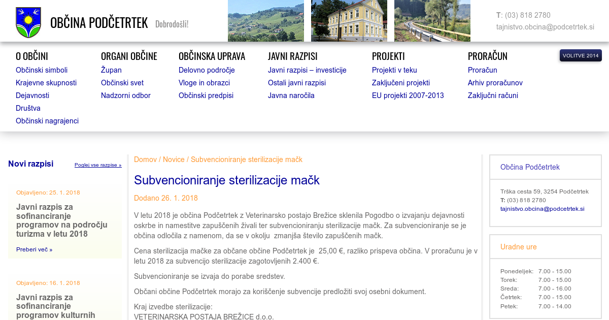 V letu 2018 je občina Podčetrtek z Veterinarsko postajo Brežice sklenila Pogodbo o izvajanju dejavnosti oskrbe in namestitve zapuščenih živali ter subvencioniranju sterilizacije mačk. Za subvencioniranje se je občina odločila z namenom, da se v okolju zmanjša število zapuščenih mačk. Cena sterilizacija mačke za občane občine Podčetrtek je 25,00 €, razliko prispeva občina. V proračunu