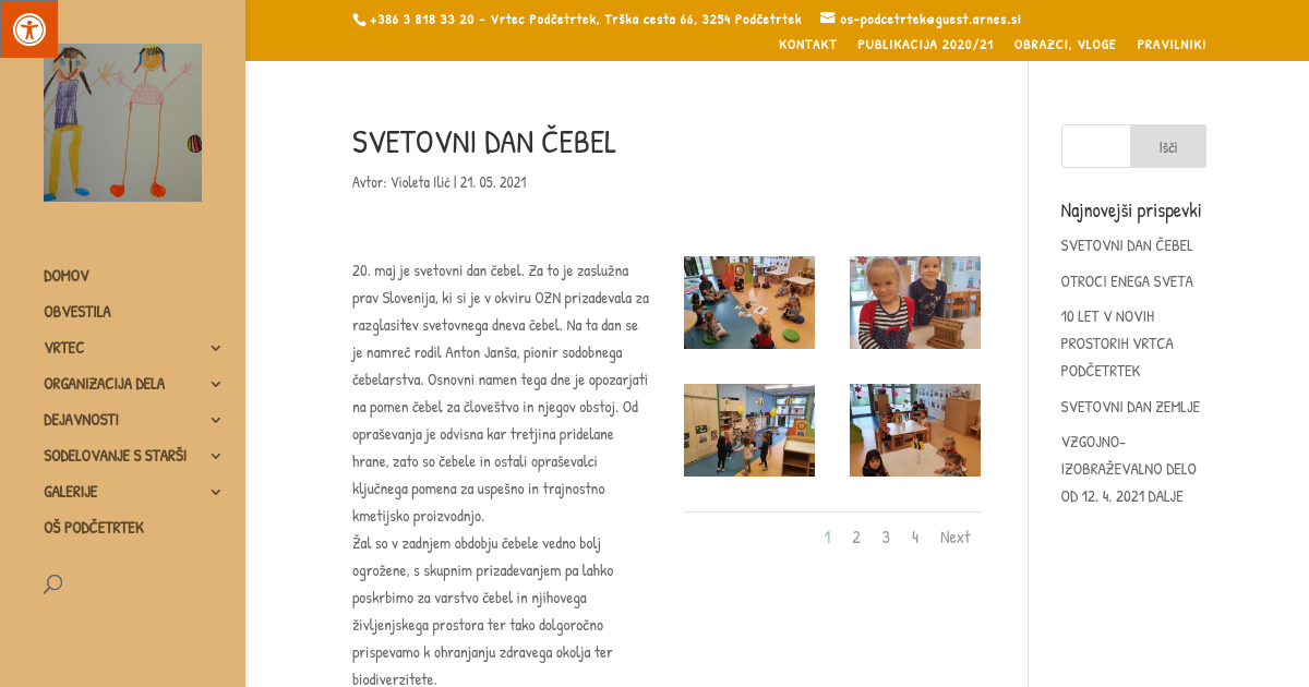 20. maj je svetovni dan čebel. Za to je zaslužna prav Slovenija, ki si je v okviru OZN prizadevala za razglasitev svetovnega dneva čebel. Na ta dan se je namreč rodil Anton Janša, pionir sodobnega čebelarstva. Osnovni namen tega dne je opozarjati na pomen čebel za človeštvo in njegov obstoj. Od opraševanja je odvisna kar tretjina pridelane hrane, zato so čebele in ostali opraševalci ključnega pomena za uspešno in trajnostno kmetijsko proizvodnjo. Žal so v zadnjem obdobju čebele vedno bolj ogrožene, s skupnim prizadevanjem pa lahko poskrbimo za varstvo čebel in njihovega življenjskega prostora ter tako dolgoročno prispevamo k ohranjanju zdravega okolja ter biodiverzitete. V našem vrtcu smo svetovni dan čebel obeležili z likovnim in plesnim ustvarjanjem, prstnimi igrami in zgodbicami o čebelah. Otroci so se seznanili z življenjem in delom čebel, kot tudi z njihovim pomenom za naravo in ljudi.