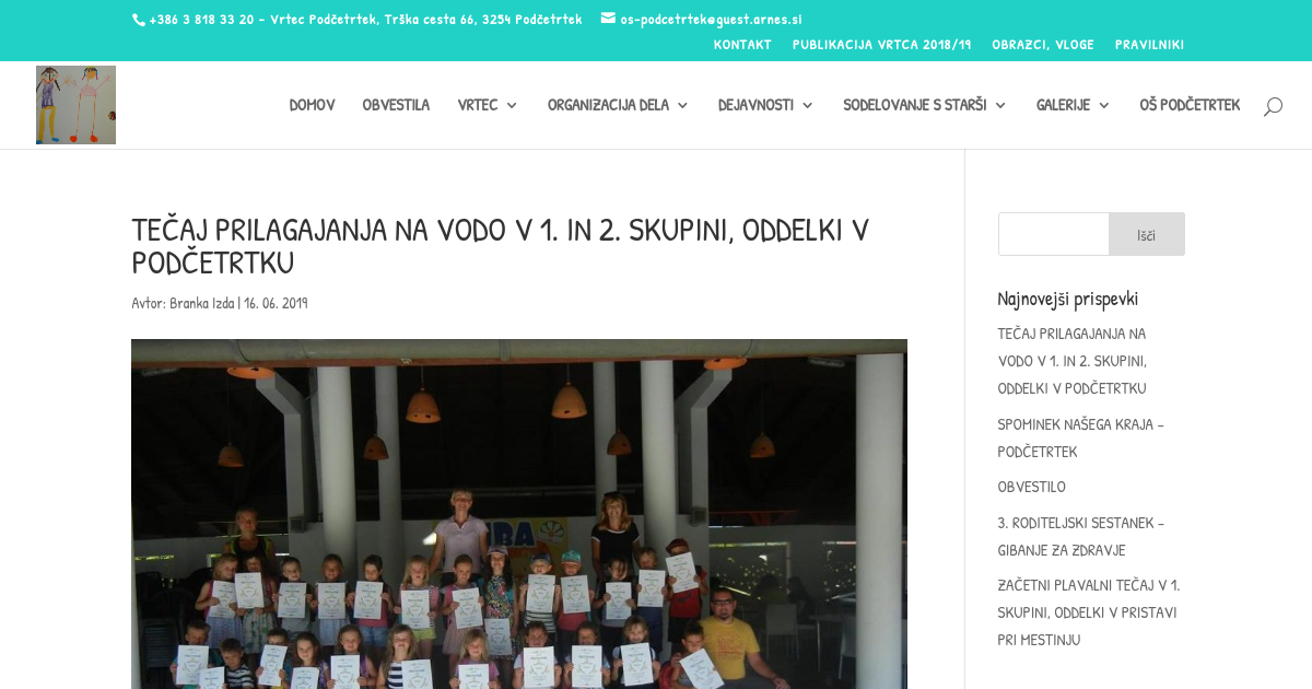 Otroci Vrtca Podčetrtek, oddelki v Podčetrtku, ki v jeseni odhajajo v šolo, so vroče junijski dneve (od 10.6.2019 do 14.6.2019, dopoldan) preživeli v Aqualuni, kjer so se v okviru projekta Mali sonček, ob pomoči/spremstvu vaditeljev plavanja: Saše Kolar, Klemna Vrbka in strokovnih delavk: Urške Sovinc, Mojce Plemenitaš, Branke Izda izvajali različne igre v vodi za prilagajanje na upor vode, potapljanje glave, izdihovanje v vodo, plovnost in drsenje na vodi. Igre v vodi in vaje za prve prave plavalne zavesljaje so otroci izvajali zelo dobro in si tako ob zaključku prislužili priznanja.