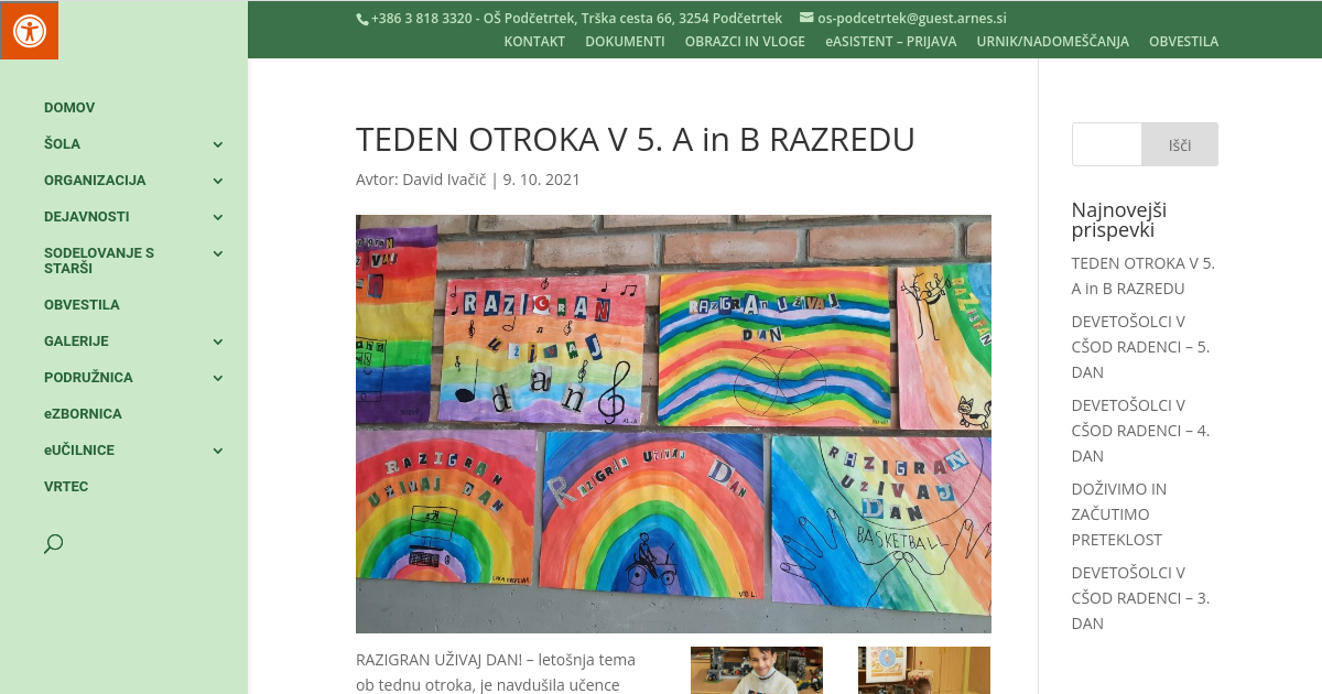 RAZIGRAN UŽIVAJ DAN! – letošnja tema ob tednu otroka, je navdušila učence petih razredov. Skozi cel teden so izvajali različne dejavnosti v katerih so bili skriti cilji različnih šolskih predmetov. Ponedeljkov BRALNI MARATON smo izvedli ob branju knjige Kakšno drevo zraste iz mačka, kjer so se učenci izkazali v nastopanjem pred razredom. Torek smo namenili MAVRICI BARV IN LEPIH MISLI, kjer so nastali čudoviti likovni izdelki. Sledil je FILM PRESENEČENJA, ki so si ga ogledali v prav posebnem kinu- zbornici šole, kjer so neizmerno uživali ob komediji Los bando. Sledila je izdelava skupinskega plakata s pozitivnimi besedami o filmu. Četrtek je potekal v duhu PLESA in USTVARJANJA. Iz palic različnih dolžin so učenci izdelali modele kock, kvadrov in piramid, kjer se je pokazalo medsebojno sodelovanje, izvirnost, komunikacija. Zadnji dan pa smo namenili skupnemu plesu in sprostitvi ob JOGI in se posladkali s čokolado.