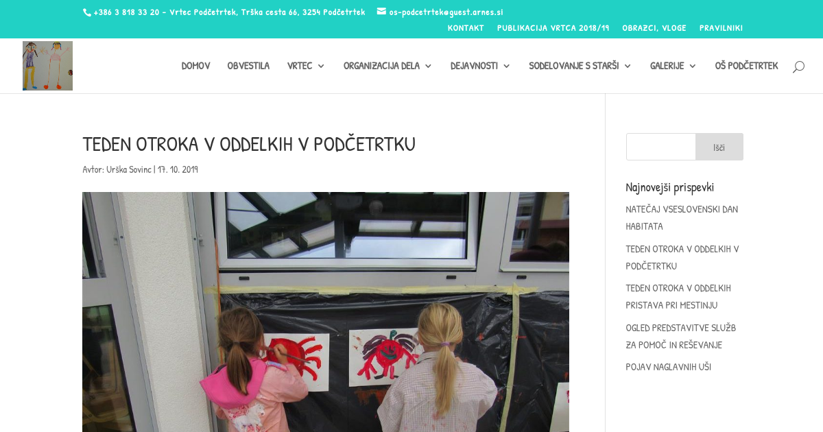 V DEŽELI PACKARIJ V ponedeljek, 7. oktobra, se je pričenjal Teden otroka na temo »NAŠE PRAVICE«. V letošnjem letu obeležujemo 30 let od sprejetja Konvencije o otrokovih pravicah (20. novembra 1989 jo je sprejela Generalna skupščina Združenih narodov), zato so se v ZPM Slovenije odločili, da bodo ravno pravice otrok osrednja tema letošnjega Tedna otroka. Osredotočili smo se na igro, saj je otrokova primarna dejavnost in tako so otroci imeli možnost izbire. Otroci so ustvarjali z naravnimi plodovi, slikali s tempera barvami jesenske plodove po lastnem navdihu, oblikovali iz domačega plastelina, slanega testa, risali z voščenkami, okušali in se sladkali z domačim sadjem ob sadni stojnici. Skozi dejavnosti so otroci spoznavali, da lahko na različne načine ustvarjajo z jesenskimi plodovi in pridelki. Otrokom igra z jesenskimi pridelki ni bila le zabavna, temveč jih je spodbudila k izbiri, ustvarjalnosti in iznajdljivosti. Vse to se je dogajalo na terasi vrtca v Podčetrtku v popoldanskem času skupaj s starši. Kljub slabemu vremenu je bilo druženje barvito, ustvarjalno in vsi skupaj smo uživali. Kaj pomeni Teden otroka na temo »Naše pravice« je Tone Pavček zapisal v pesmi; Pravica pravic je pravica živeti, biti otrok, za srečo rojen, tata in mamo ob sebi imeti in jim padati veselo v objem.