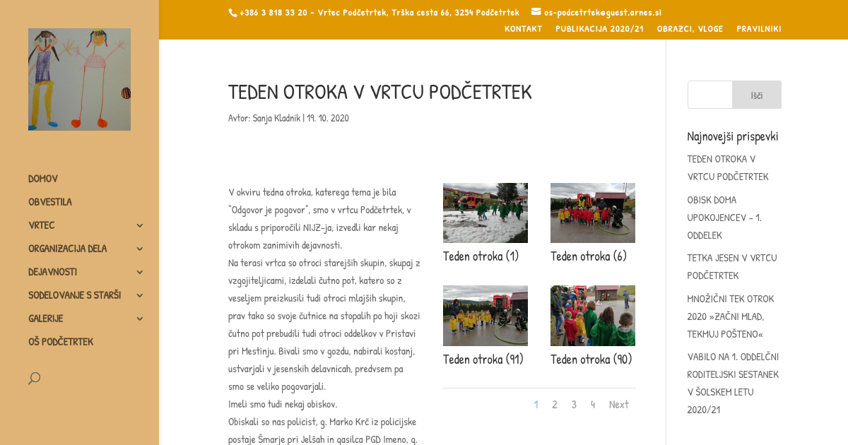 V okviru tedna otroka, katerega tema je bila “Odgovor je pogovor”, smo v vrtcu Podčetrtek, v skladu s priporočili NIJZ-ja, izvedli kar nekaj otrokom zanimivih dejavnosti. Na terasi vrtca so otroci starejših skupin, skupaj z vzgojiteljicami, izdelali čutno pot, katero so z veseljem preizkusili tudi otroci mlajših skupin, prav tako so svoje čutnice na stopalih po hoji skozi čutno pot prebudili tudi otroci oddelkov v Pristavi pri Mestinju. Bivali smo v gozdu, nabirali kostanj, ustvarjali v jesenskih delavnicah, predvsem pa smo se veliko pogovarjali. Imeli smo tudi nekaj obiskov. Obiskali so nas policist, g. Marko Krč iz policijske postaje Šmarje pri Jelšah in gasilca PGD Imeno, g. Benjamin Alegro in g. Ivan Kolar, ter skupina gasilcev PGD Pristava pri Mestinju. Predstavili so svoje delo, delovno opremo, otroci pa so bili najbolj navdušeni, ko so prižgali lučke na vozilih in vklopili sireno ter si ogledali intervencijo gašenja požara. Otroke oddelkov v Pristavi pri Mestinju pa je poleg tega navdušenja še bolj prevzel ogled praktične izvedbe intervencije gašenja požara v leseni brunarici na parkirišču in otroška zabava v »penastem oblaku« gasilne pene. V tednu otroka nas je po skupinah obiskala tudi šolska knjižničarka, ga Mara Hunski, ki nam je predstavila različne pravljice – Anček podganček, O miški ki je zbirala pogum, ter Moja babica je pripovedovala. Vsem obiskovalce se lepo zahvaljujemo za sodelovanje in komaj čakamo, da nas ob kakšni priložnosti še obiščejo.