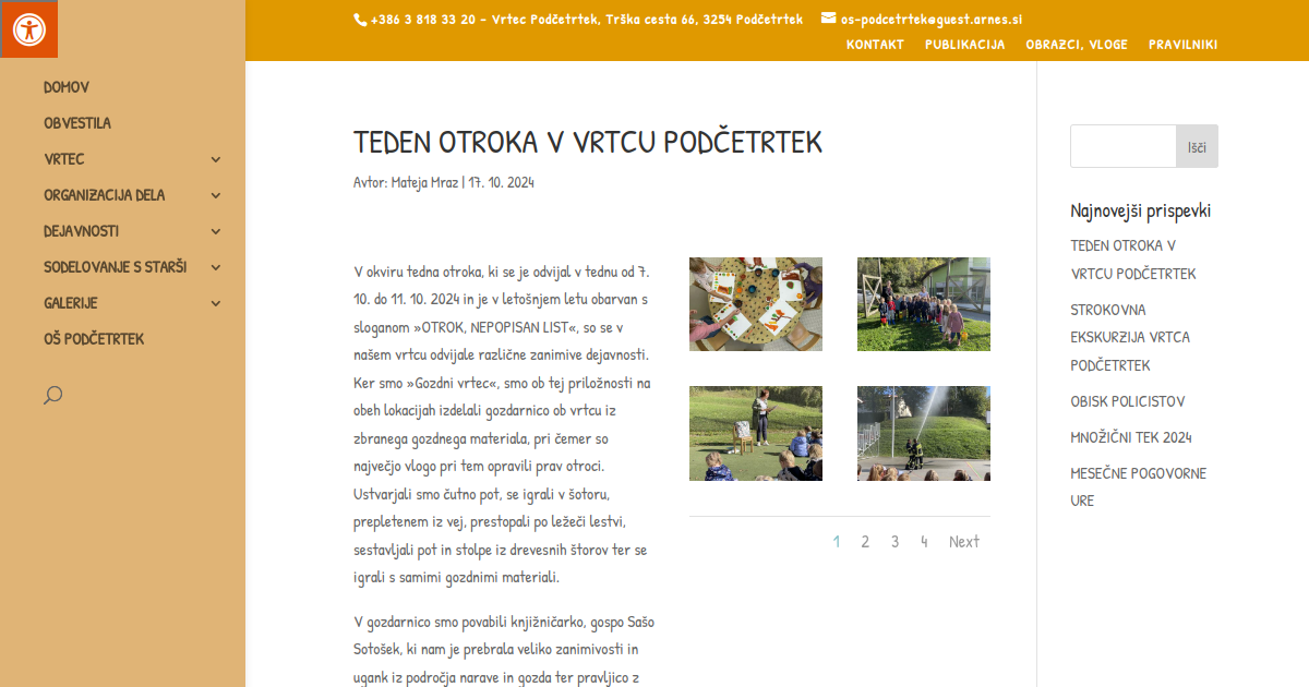 V okviru tedna otroka, ki se je odvijal v tednu od 7. 10. do 11. 10. 2024 in je v letošnjem letu obarvan s sloganom »OTROK, NEPOPISAN LIST«, so se v našem vrtcu odvijale različne zanimive dejavnosti. Ker smo »Gozdni vrtec«, smo ob tej priložnosti na obeh lokacijah izdelali gozdarnico ob vrtcu iz zbranega gozdnega materiala, pri čemer so največjo vlogo pri tem opravili prav otroci. Ustvarjali smo čutno pot, se igrali v šotoru, prepletenem iz vej, prestopali po ležeči lestvi, sestavljali pot in stolpe iz drevesnih štorov ter se igrali s samimi gozdnimi materiali.