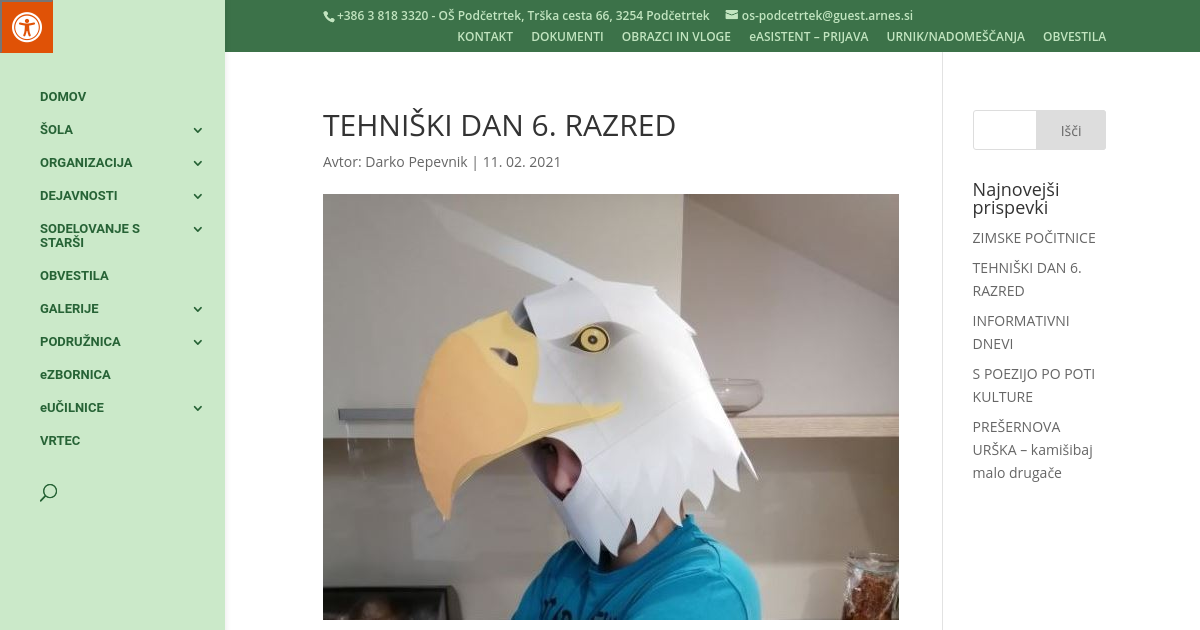 V sredo, 10. februarja 2021, smo s šestošolci izvedli tehniški dan, ki je zaradi trenutnih razmer še vedno potekal na daljavo. Učenci so že kar po uvodnem video-srečanju aktivno pričeli z delom. Večina med njimi si je izdelovala pustne maske, nekateri med njimi so izdelovali mostove iz papirja ter s kovanci preizkušali njihovo nosilnost. Spet drugi so drobili kamnine različnih barv, iz katerih so pripravljali barvila na osnovi vode, olja in celo jajc. Najbolj pogumni pa so se preizkusili tudi v lastni pripravi jabolčnega kisa. Fotografije ustvarjalnih učencev dokazujejo, da so izbrane aktivnosti odgovorno in vestno opravili. Ob ogledu fotografij vaših izdelkov sva ponosna na vašo iznajdljivost in kreativnost,