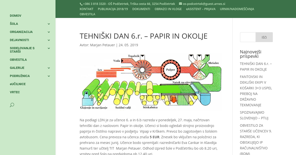Na podlagi LDN je za učence 6. a in 6.b razreda v ponedeljek, 27. maja, načrtovan tehniški dan z naslovom: Papir in okolje. Učenci si bodo ogledali strojno proizvodnjo papirja in čistilno napravo v podjetju Vipap v Krškem. Prevoz bo zagotovljen s šolskim avtobusom. Cena prevoza na učenca znaša 5 EUR. Znesek bo vključen na položnici za prehrano za mesec junij. Učence bodo spremljali: razredničarki Eva Cankar in Klavdija Namurš ter učitelj TIT Marjan Petauer. Odhod izpred šole v Podčetrtku bo ob 8.20 uri, vrnitev pred šolo pa predvidoma ob 12.40 uri.
