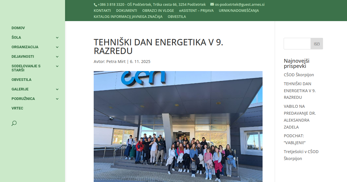 V sredo, 5. 11. 2025, so se devetošolci udeležili tehniškega dne Energetika. Odšli so v Brežice na ogled tamkajšnje hidroelektrarne, nato v Krško na ogled Sveta energije v GEN in avtobusni ogled jedrske elektrarne ter na koncu v Brestanico na ogled TEB.