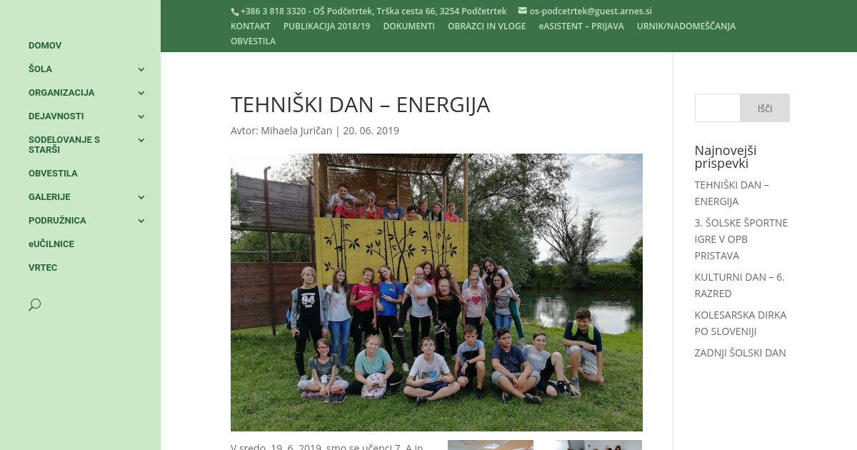 V sredo, 19. 6. 2019, smo se učenci 7. A in 7. B razreda odpravili proti Krškem, kjer smo v Svetu energije – interaktivnem centru o energiji in energetiki – izvedeli mnogo novega o elektriki in v eksperimentalnici tudi sami izvajali poskuse. Nato smo se odpeljali v Brežice. V Posavskem muzeju smo se sprehodili čez veličastno viteško dvorano in številne zgodovinske zbirke, ki osvetljujejo življenje ljudi od prvih naselitev do poznega srednjega veka. V delavnici smo se postavili v kožo čisto pravih restavratorjev, saj smo morali iz razbitin sestaviti različne posode. Po ogledu muzeja smo se peš napotili na kosilo. Siti in pripravljeni na akcijo smo se nato odpeljali do reke Krke, kjer nas je že čakala soba pobega na prostem in naš mojster igre. Sami smo se razdelili v dve skupini in čakali nadaljnja navodila. Medtem ko je prva skupina pogumno odšla v sobo pobega, se je druga igrala in uživala na igralih. Po eni uri smo se zamenjali. Absolutna zmagovalka je bila druga skupina, ki je podrla rekord igre za celih pet minut! Malce užaljena prva skupina se je izgovarjala na dejstvo, da so imeli dva igralca manj. Po krajši sprostitvi smo posneli še skupne fotografije in se odpravili domov. Ta dan ne bomo zlahka pozabili, saj smo se imeli zelo fajn. Bilo je lepo in nepozabno.