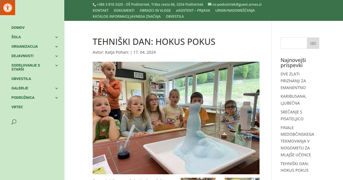 Danes je bil za prvošolce in drugošolce prav poseben dan, saj so imeli tehniški dan z naslovom Hokus pokus. Razdeljeni v pet heterogenih skupin so se podali na zabavno pot učenja in raziskovanja. Obiskali so različne delavnice: