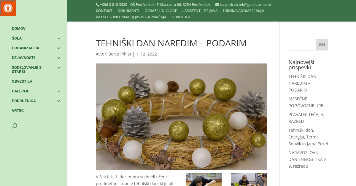 V četrtek, 1. decembra so imeli učenci predmetne stopnje tehniški dan, ki je bil namenjen izdelavi izdelkov, ki bodo v četrtek 8. decembra ponujeni na stojnicah, v okviru prireditve na kateri se bodo učenci predstavili s kulturnim programom. Učenci so v okviru oddelkov pod vodstvom učiteljev izdelovali izdelke, ki bodo družinam, polepšali domove in naredili praznični december lepši. Pekli so pecivo izdelovali božično novoletno dekoracijo, čestitke, jelenčke ter še mnogo lepega.