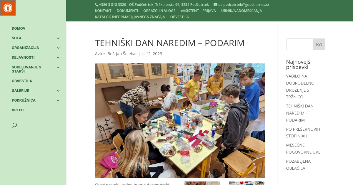 Skozi pretekli teden in prvi decembrski ponedeljek so učenci naše šole na tehniških dnevih izdelovali izdelke za novoletni bazar. Kakor vsak šolski dan je tudi tokrat bilo v ospredju izobraževanje in urjenje veščin naših šolarjev, le da je temu bila to pot dodana še nota dobrodelnosti, saj bodo prav vsi izdelki del naše četrtkove prireditve, katere izkupiček bo namenjen šolskemu skladu. Nastalo je zelo veliko lepih izdelkov, ki si jih malce za pokušino lahko ogledate v spodnji fotogaleriji, a še bolje je, da si jih pridete v četrtek ogledati v živo.