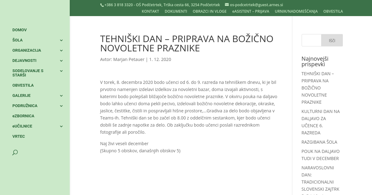 V torek, 8. decembra 2020 bodo učenci od 6. do 9. razreda na tehniškem dnevu, ki je bil prvotno namenjen izdelavi izdelkov za novoletni bazar, doma izvajali aktivnosti, s katerimi bodo polepšali bližajoče božično novoletne praznike. V okviru pouka na daljavo bodo lahko učenci doma pekli pecivo, izdelovali božično novoletne dekoracije, okraske, jaslice, čestitke, čistili in pospravljali hišne prostore,…Gradiva za delo bodo objavljena v Teams-ih. Tehniški dan se bo začel ob 8.00 z oddelčnim sestankom, kjer bodo učenci dobili še zadnje napotke za delo. Ob zaključku bodo učenci poslali razrednikom fotografije ali poročilo.