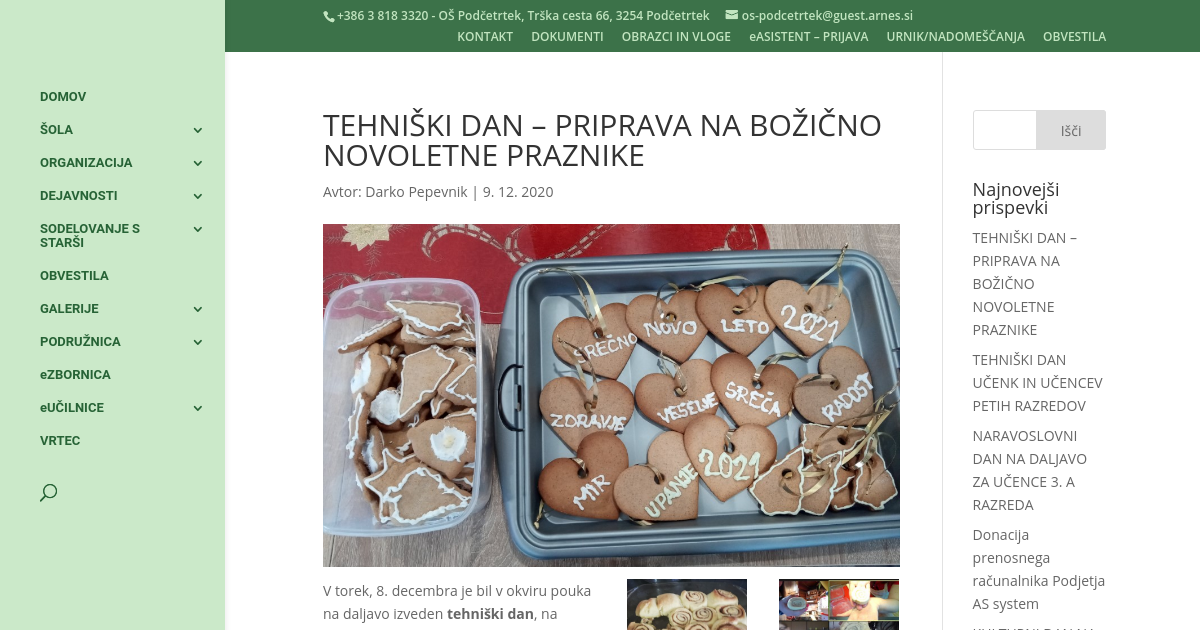 V torek, 8. decembra je bil v okviru pouka na daljavo izveden tehniški dan, na katerem so učenci od 6. do 9. razreda izdelovali izdelke primerne za božično novoletne praznike. Izdelovali so voščilnice, okraske, Božičke, ptičje hišice, jaslice pekli medenjake in različne vrste peciva, izdelali medene hiške, pomagali na kolinah…(FOTOGALERIJA)