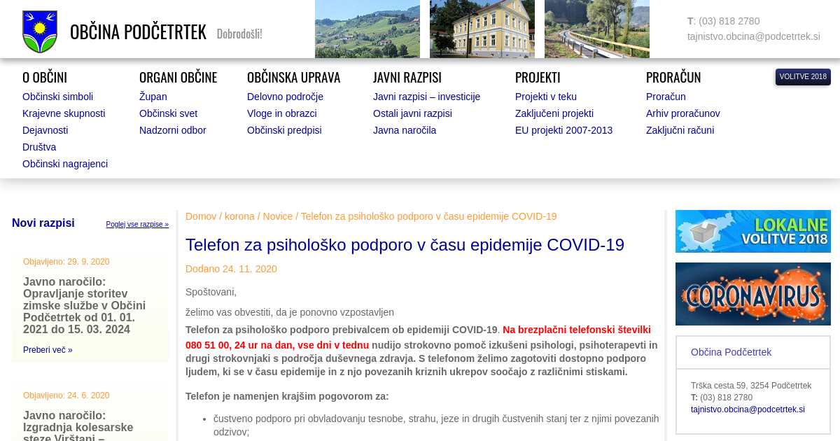 Spoštovani, želimo vas obvestiti, da je ponovno vzpostavljen Telefon za psihološko podporo prebivalcem ob epidemiji COVID-19. Na brezplačni telefonski številki 080 51 00, 24 ur na dan, vse dni v tednu nudijo strokovno pomoč izkušeni psihologi, psihoterapevti in drugi strokovnjaki s področja duševnega zdravja. S telefonom želimo zagotoviti dostopno podporo ljudem, ki se v času epidemije