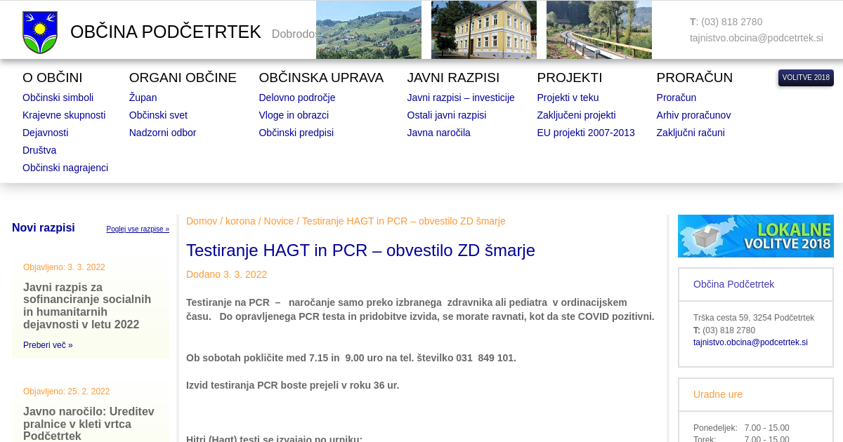Testiranje na PCR – naročanje samo preko izbranega zdravnika ali pediatra v ordinacijskem času. Do opravljenega PCR testa in pridobitve izvida, se morate ravnati, kot da ste COVID pozitivni. Ob sobotah pokličite med 7.15 in 9.00 uro na tel. številko 031 849 101. Izvid testiranja PCR boste prejeli v roku 36 ur. Hitri (Hagt) testi se izvajajo po urniku: Zdravstvena postaja Šmarje
