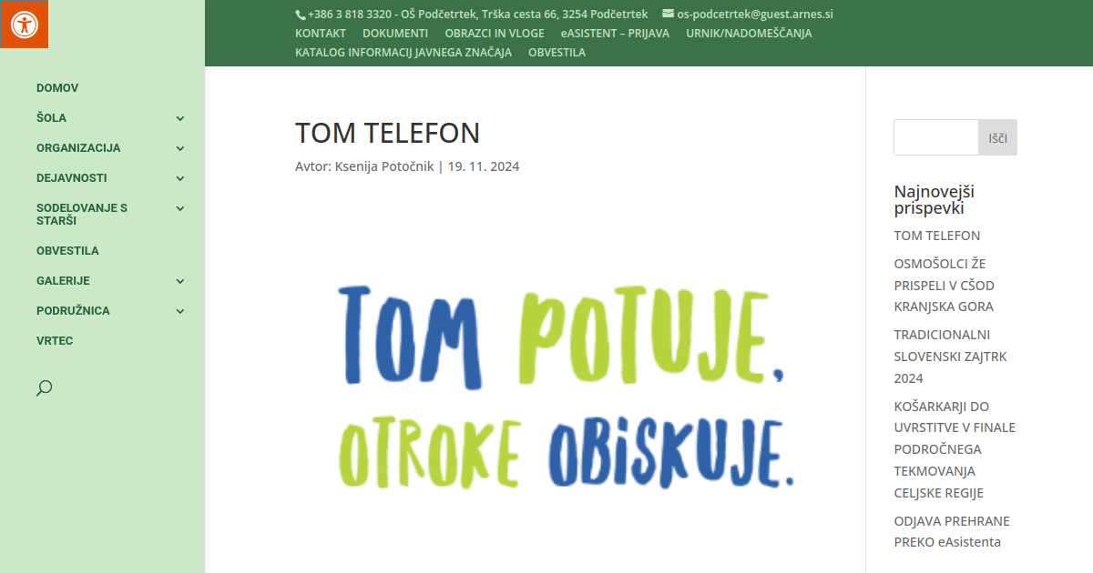 18. novembra se je začela dvotedenska akcija »TOM potuje, otroke obiskuje«. V namen ozaveščanja smo na šolskem hodniku uredili oglasno desko, v 4. in 7. razredih pa bomo izvedli tudi delavnice na to temo. TOM telefon je brezplačna telefonska številka (116 111), na katero lahko otroci in mladostniki, kadar se želijo pogovoriti o svojih težavah in stiskah, pokličejo vsak dan, tudi ob nedeljah in praznikih, med 12. in 20. uro. Na voljo je tudi TOM klepetalnica in TOM e-pošta tom@zpms.si. Svetovalci na TOM-u so prostovoljci, ki del svojega časa namenijo pogovorom z otroki in mladimi. So različnih starosti in poklicev in se pred pričetkom svetovanja udeležijo obsežnega izobraževanja o vodenju svetovalnega pogovora in tematikah, povezanih z odraščanjem. Pogovori so anonimni in zaupni, svetovalci pa so odprti in prijazni in so pripravljeni poslušati brez obsojanja. Njihov slogan je: ODGOVOR JE POGOVOR.