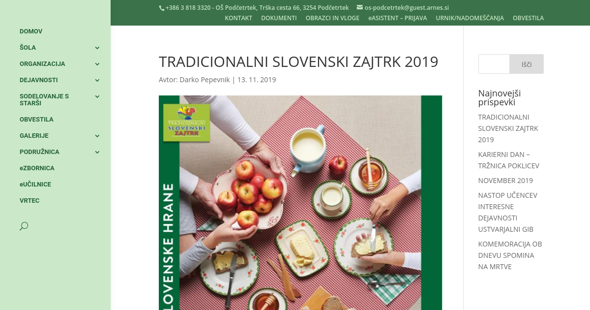 Tradicionalni slovenski zajtrk bo tudi letos eden izmed osrednjih dogodkov dneva slovenske hrane, ki ga bomo obeležili v petek, 15. novembra 2019. Vsi otroci in delavci šole in vrtca bomo ta dan zajtrkovali
