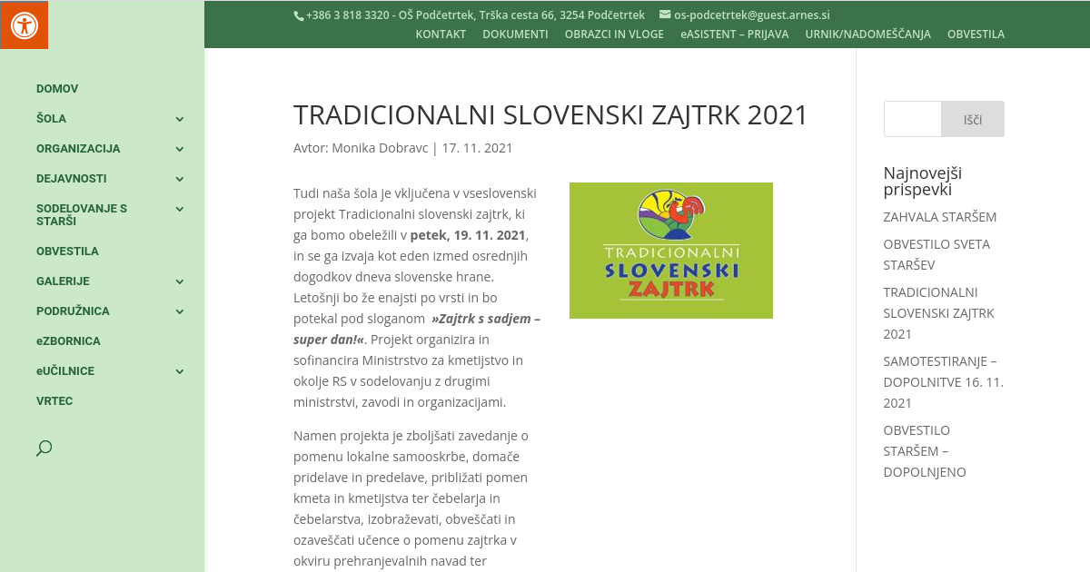 Tudi naša šola je vključena v vseslovenski projekt Tradicionalni slovenski zajtrk, ki ga bomo obeležili v petek, 19. 11. 2021, in se ga izvaja kot eden izmed osrednjih dogodkov dneva slovenske hrane. Letošnji bo že enajsti po vrsti in bo potekal pod sloganom »Zajtrk s sadjem – super dan!«. Projekt organizira in sofinancira Ministrstvo za kmetijstvo in okolje RS v sodelovanju z drugimi ministrstvi, zavodi in organizacijami.