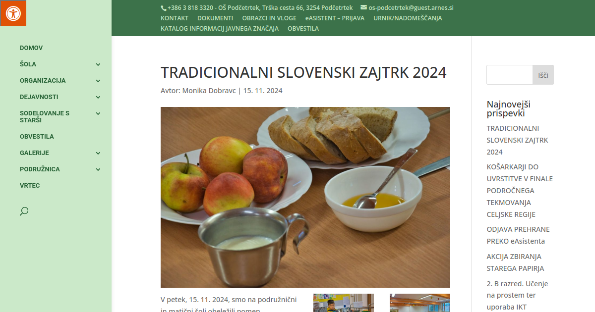 V petek, 15. 11. 2024, smo na podružnični in matični šoli obeležili pomen slovenskega tradicionalnega zajtrka. Učencem smo ponudili temni kruh, maslo, med, mleko in jabolka lokalnih proizvajalcev.