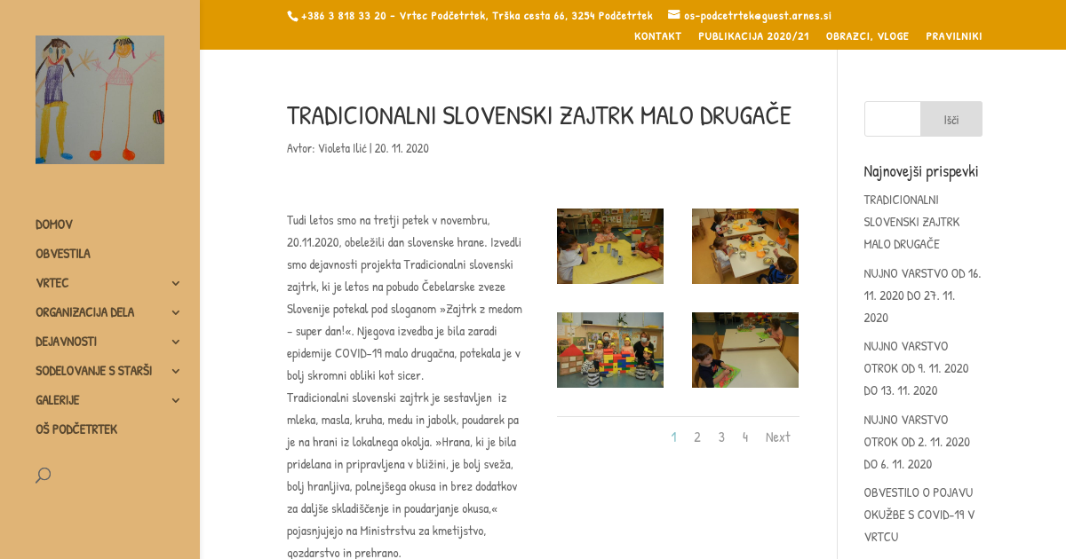 Tudi letos smo na tretji petek v novembru, 20.11.2020, obeležili dan slovenske hrane. Izvedli smo dejavnosti projekta Tradicionalni slovenski zajtrk, ki je letos na pobudo Čebelarske zveze Slovenije potekal pod sloganom »Zajtrk z medom – super dan!«. Njegova izvedba je bila zaradi epidemije COVID-19 malo drugačna, potekala je v bolj skromni obliki kot sicer. Tradicionalni slovenski zajtrk je sestavljen iz mleka, masla, kruha, medu in jabolk, poudarek pa je na hrani iz lokalnega okolja. »Hrana, ki je bila pridelana in pripravljena v bližini, je bolj sveža, bolj hranljiva, polnejšega okusa in brez dodatkov za daljše skladiščenje in poudarjanje okusa,« pojasnjujejo na Ministrstvu za kmetijstvo, gozdarstvo in prehrano. Namen projekta je izobraževati otroke o temah kot so zdrav način prehranjevanja, pomen čebel, čebelarstva in lokalne pridelave hrane, varstvo in skrb za okolje ter vzgoja in izobraževanje za trajnostni razvoj. Z otroki, vključenimi v nujno varstvo, smo tako že ves teden pridno ustvarjali na temo čebelic: narisali smo risbice, izdelovali čebelice, zapeli pesem Čebelar, se zavrteli ob ritmih plesne igre Čebelice, prisluhnili čebelarski himni, spoznali življenje čebel in delo čebelarja (slikovno gradivo, videoposnetki) ter zdravo prehrano.