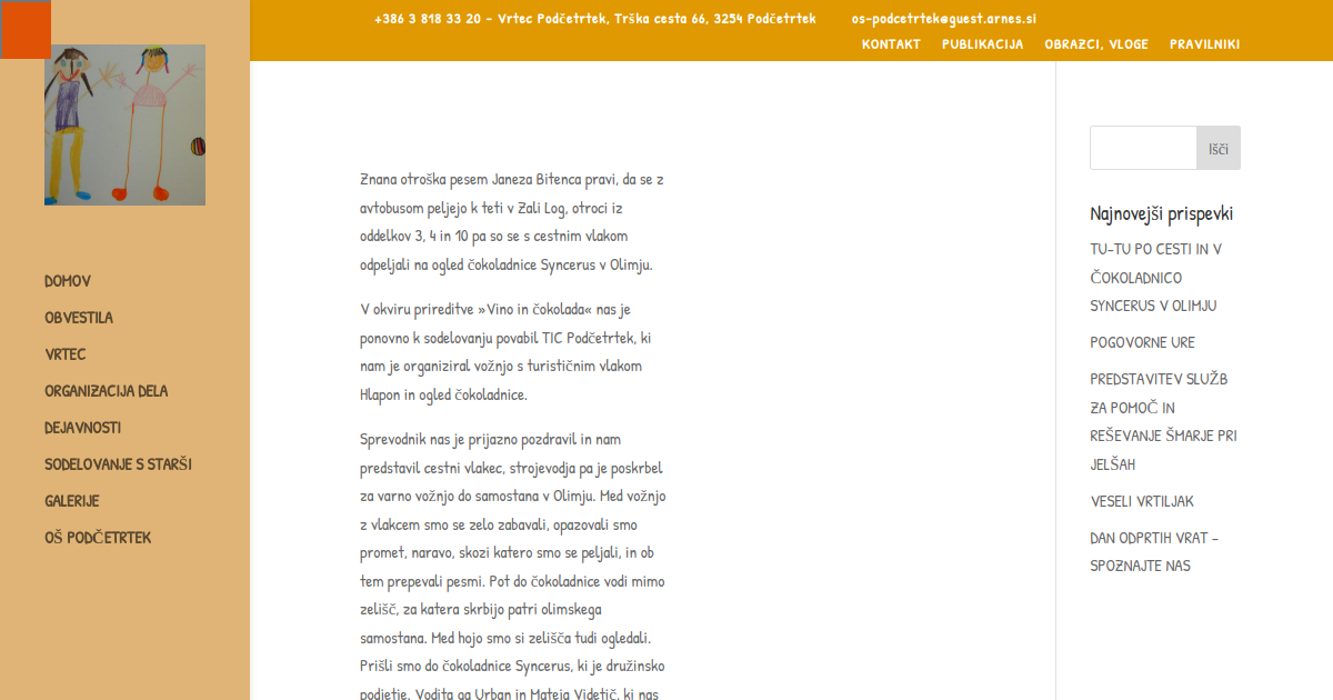Znana otroška pesem Janeza Bitenca pravi, da se z avtobusom peljejo k teti v Zali Log, otroci iz oddelkov 3, 4 in 10 pa so se s cestnim vlakom odpeljali na ogled čokoladnice Syncerus v Olimju.