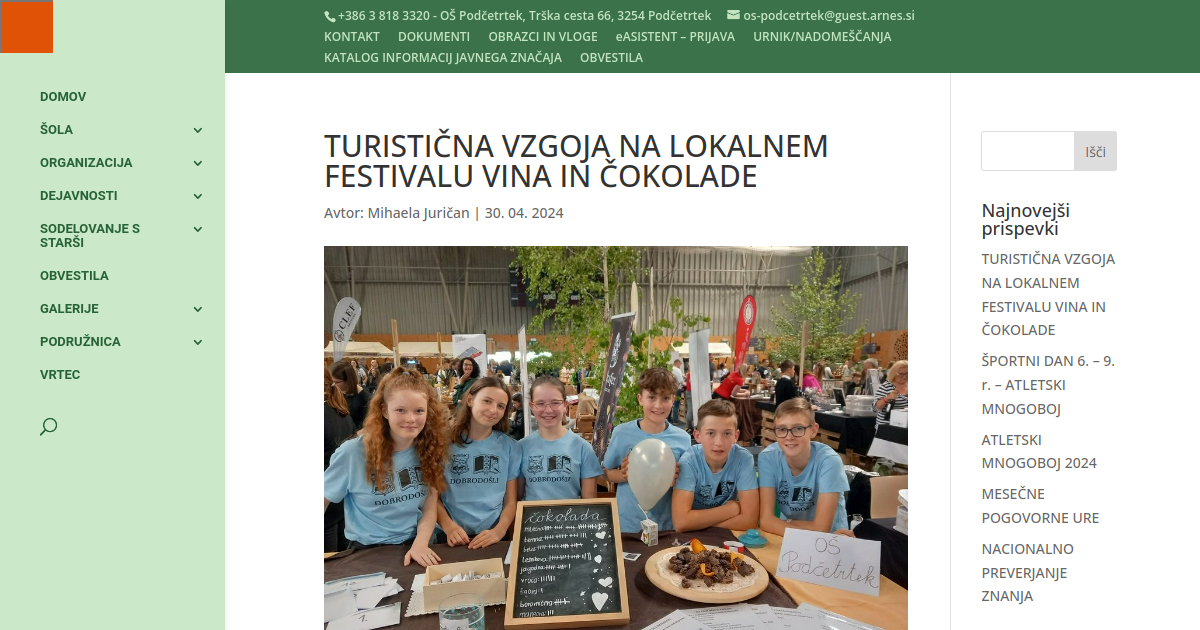 Na letošnjem festivalu Vina in čokolade, ki ga že devetič organizira Turizem Podčetrtek, Bistrica ob Sotli in Kozje, GIZ, so se na svoji čokoladno-turistični stojnici predstavljali tudi učenci izbirnega predmeta Turistična vzgoja. Za predstavitev kraja in predvsem lokalne šole so pripravili dve nagradni igri ter sladke in zabavne zanimivosti. Številni udeleženci so lahko svoje znanje preverili z vprašanji pri kvizu iz kar šestih predmetnih področij ali pa se lotili sestavljanja fotografij čokoladnih dobrot. Turistična stojnica je ponujala številne čokoladne sladice, ki so jih učenci pripravili sami. Kot dodatni in med obiskovalci odlično sprejeti popestritvi sta se izkazala velik foto okvir, ki je ponujal možnost ustvarjanja zanimivih portretov, in mini raziskava o priljubljenosti različnih čokolad, kjer je slavila mlečna čokolada.