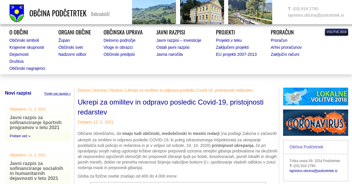 Občane obveščamo, da imajo tudi občinski, medobčinski in mestni redarji (na podlagi Zakona o začasnih ukrepih za omilitev in odpravo posledic COVID-19, ki poleg zdravstvenega inšpektorata za ukrepanje pooblašča tudi policijo in redarstva in je v veljavi od sobote, 24. 10. 2020) pristojnost ukrepanja, če pri opravljanju svojih nalog ugotovijo kršitve ukrepov prepovedi oziroma omejitvi gibanja prebivalstva