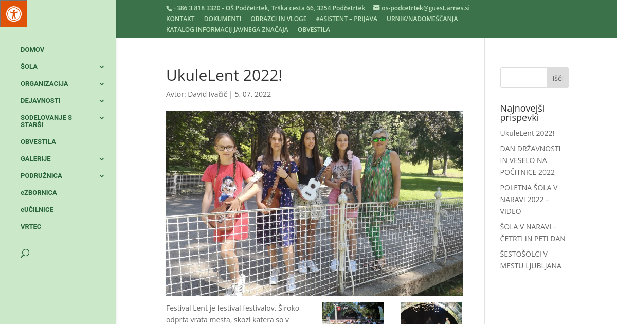 Ukulela je majhen inštrument po izmeri, a velik po zadovoljstvu, ki ga čutimo, ko ubiramo strune. Lani naše učenke pod odrom, letos pa na povabilo svetovalke za glasbeno umetnost dr. Inge Breznik že na odru, kjer so z mentorico Mihaelo Pihler, prof. učiteljico glasbene umetnosti na OŠ Podčetrtek, mentorico kar treh glasbenih izbirnih predmetov in zborovodkinjo šolskih zborov izvedle delavnico skupinskega petja slovenskih ljudskih in ponarodelih pesmi ob spremljavi ukulel.