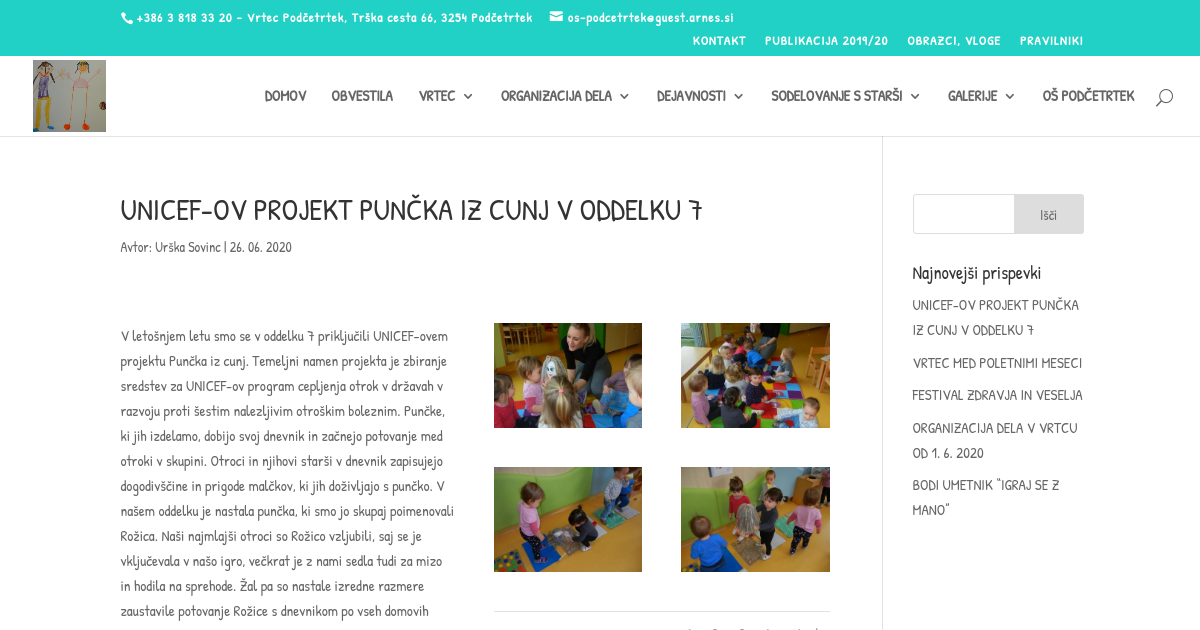 V letošnjem letu smo se v oddelku 7 priključili UNICEF-ovem projektu Punčka iz cunj. Temeljni namen projekta je zbiranje sredstev za UNICEF-ov program cepljenja otrok v državah v razvoju proti šestim nalezljivim otroškim boleznim. Punčke, ki jih izdelamo, dobijo svoj dnevnik in začnejo potovanje med otroki v skupini. Otroci in njihovi starši v dnevnik zapisujejo dogodivščine in prigode malčkov, ki jih doživljajo s punčko. V našem oddelku je nastala punčka, ki smo jo skupaj poimenovali Rožica. Naši najmlajši otroci so Rožico vzljubili, saj se je vključevala v našo igro, večkrat je z nami sedla tudi za mizo in hodila na sprehode. Žal pa so nastale izredne razmere zaustavile potovanje Rožice s dnevnikom po vseh domovih otrok. Nam pa je kljub temu otrokom uspelo ustvariti lepe spomine in pozitivne izkušnje s vključitvijo v izbran projekt. Rožico z dnevnikom smo ob koncu vrtčevskega leta poslali na UNICEF Slovenija, kjer so pripravili virtualno razstavo.