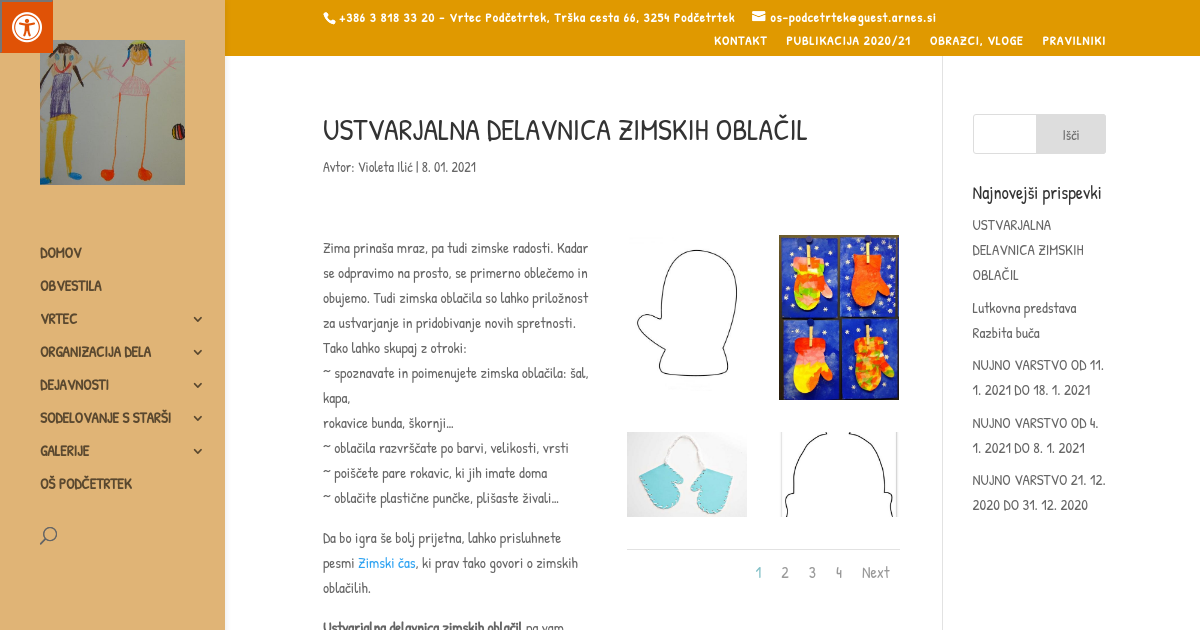 Zima prinaša mraz, pa tudi zimske radosti. Kadar se odpravimo na prosto, se primerno oblečemo in obujemo. Tudi zimska oblačila so lahko priložnost za ustvarjanje in pridobivanje novih spretnosti. Tako lahko skupaj z otroki: ~ spoznavate in poimenujete zimska oblačila: šal, kapa, rokavice bunda, škornji… ~ oblačila razvrščate po barvi, velikosti, vrsti ~ poiščete pare rokavic, ki jih imate doma ~ oblačite plastične punčke, plišaste živali…