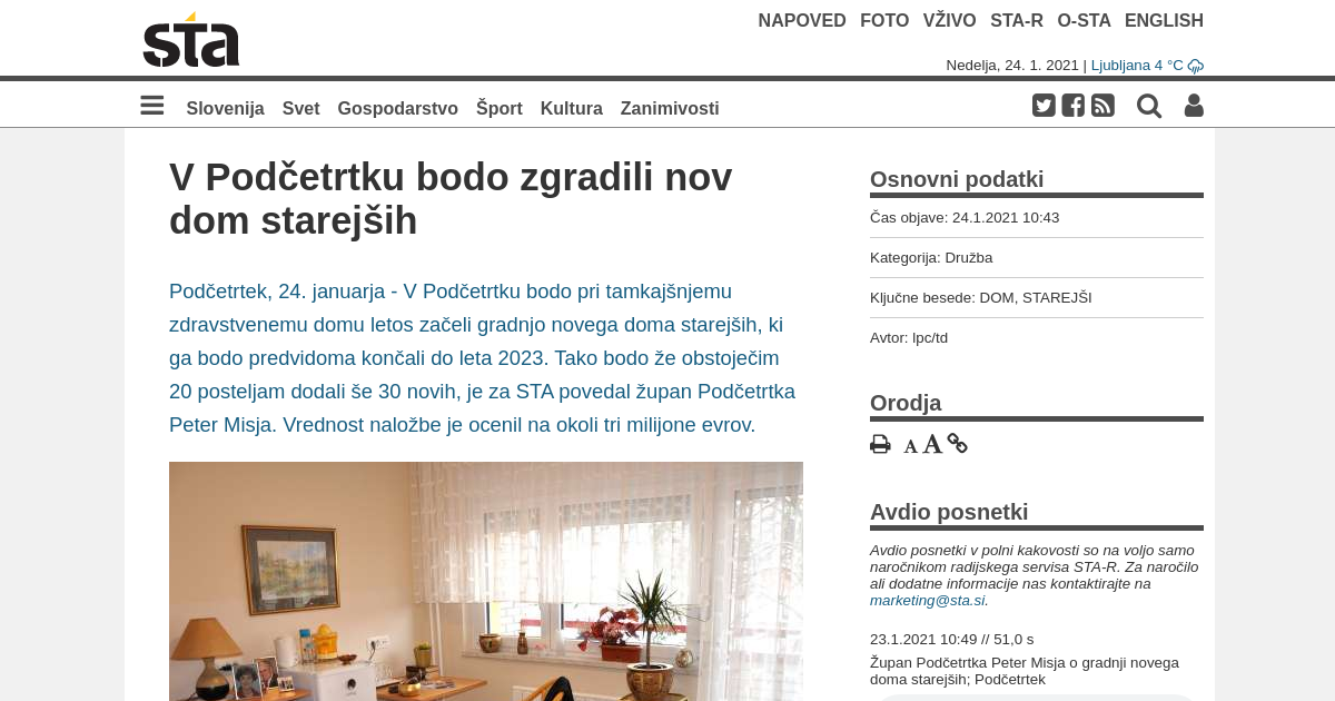 V Podčetrtku bodo pri tamkajšnjemu zdravstvenemu domu letos začeli gradnjo novega doma starejših, ki ga bodo predvidoma končali do leta 2023. Tako bodo že obstoječim 20 posteljam dodali še 30 novih, je za STA povedal župan Podčetrtka Peter Misja. Vrednost naložbe je ocenil na okoli tri milijone evrov.