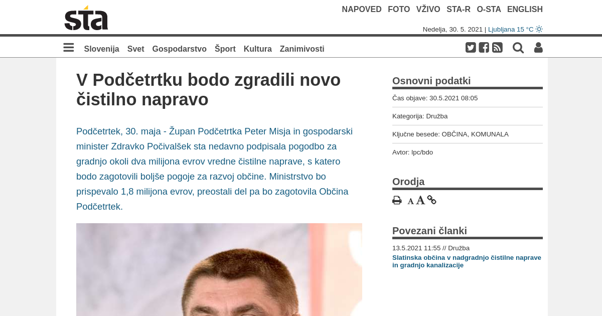 Župan Podčetrtka Peter Misja in gospodarski minister Zdravko Počivalšek sta nedavno podpisala pogodbo za gradnjo okoli dva milijona evrov vredne čistilne naprave, s katero bodo zagotovili boljše pogoje za razvoj občine. Ministrstvo bo prispevalo 1,8 milijona evrov, preostali del pa bo zagotovila Občina Podčetrtek.