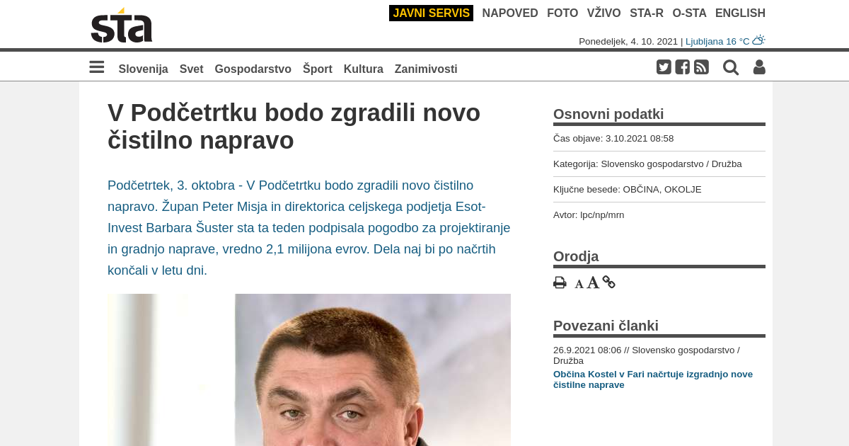 V Podčetrtku bodo zgradili novo čistilno napravo. Župan Peter Misja in direktorica celjskega podjetja Esot-Invest Barbara Šuster sta ta teden podpisala pogodbo za projektiranje in gradnjo naprave, vredno 2,1 milijona evrov. Dela naj bi po načrtih končali v letu dni.