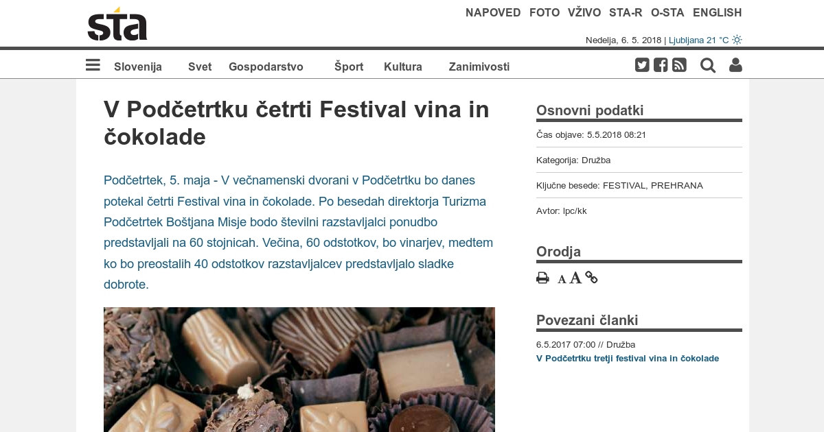 V večnamenski dvorani v Podčetrtku bo danes potekal četrti Festival vina in čokolade. Po besedah direktorja Turizma Podčetrtek Boštjana Misje bodo številni razstavljalci ponudbo predstavljali na 60 stojnicah. Večina, 60 odstotkov, bo vinarjev, medtem ko bo preostalih 40 odstotkov razstavljalcev predstavljalo sladke dobrote.