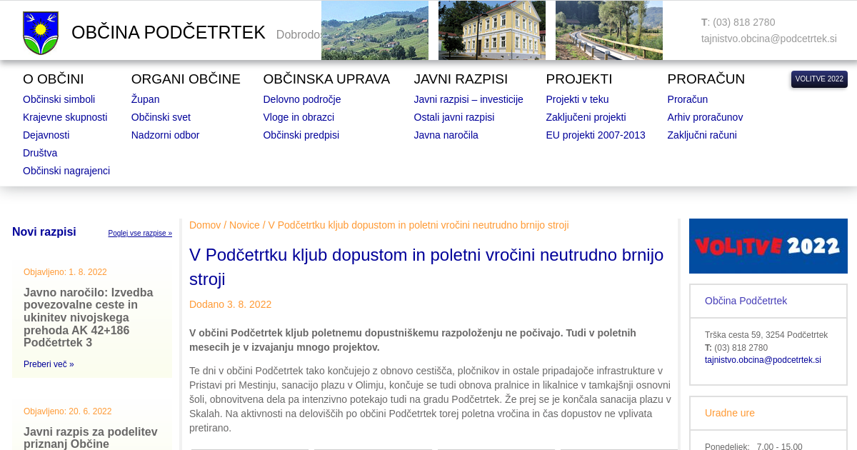 V občini Podčetrtek kljub poletnemu dopustniškemu razpoloženju ne počivajo. Tudi v poletnih mesecih je v izvajanju mnogo projektov. Te dni v občini Podčetrtek tako končujejo z obnovo cestišča, pločnikov in ostale pripadajoče infrastrukture v Pristavi pri Mestinju, sanacijo plazu v Olimju, končuje se tudi obnova pralnice in likalnice v tamkajšnji osnovni šoli, obnovitvena dela pa